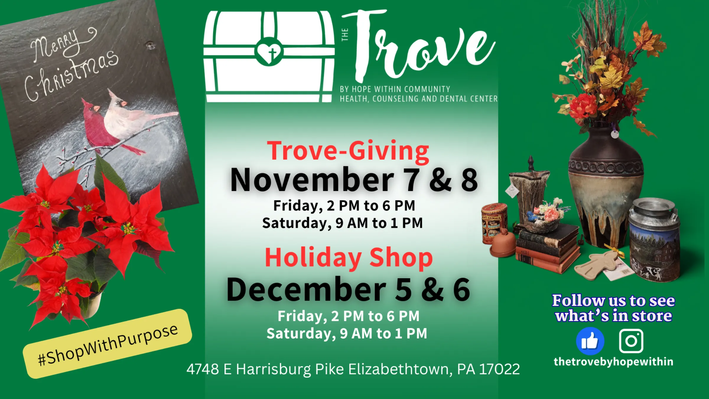 Pick up will be at Hope Within Community Health, Counseling, and Dental Center, 4748 E Harrisburg Pike, Elizabethtown, PA during our Holiday Shop Hours.